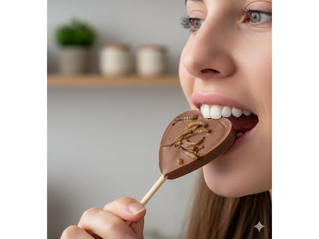 Der Schokoladenlutscher mit Insekten wird von Hand aus Milchschokolade mit getrockneten Würmern hergestellt. Die gesalzenen Würmer in jedem Stück sorgen für ein angenehmes Knuspern, und das Salz unterstreicht und verstärkt den Geschmack. Qualität steht an erster Stelle. Wir stellen die Schokolade in Zusammenarbeit mit der Schokoladenfabrik Janek von Hand her. Der volle Geschmack der Kakaobohnen wird durch das salzige Aroma der Würmer unterstrichen.