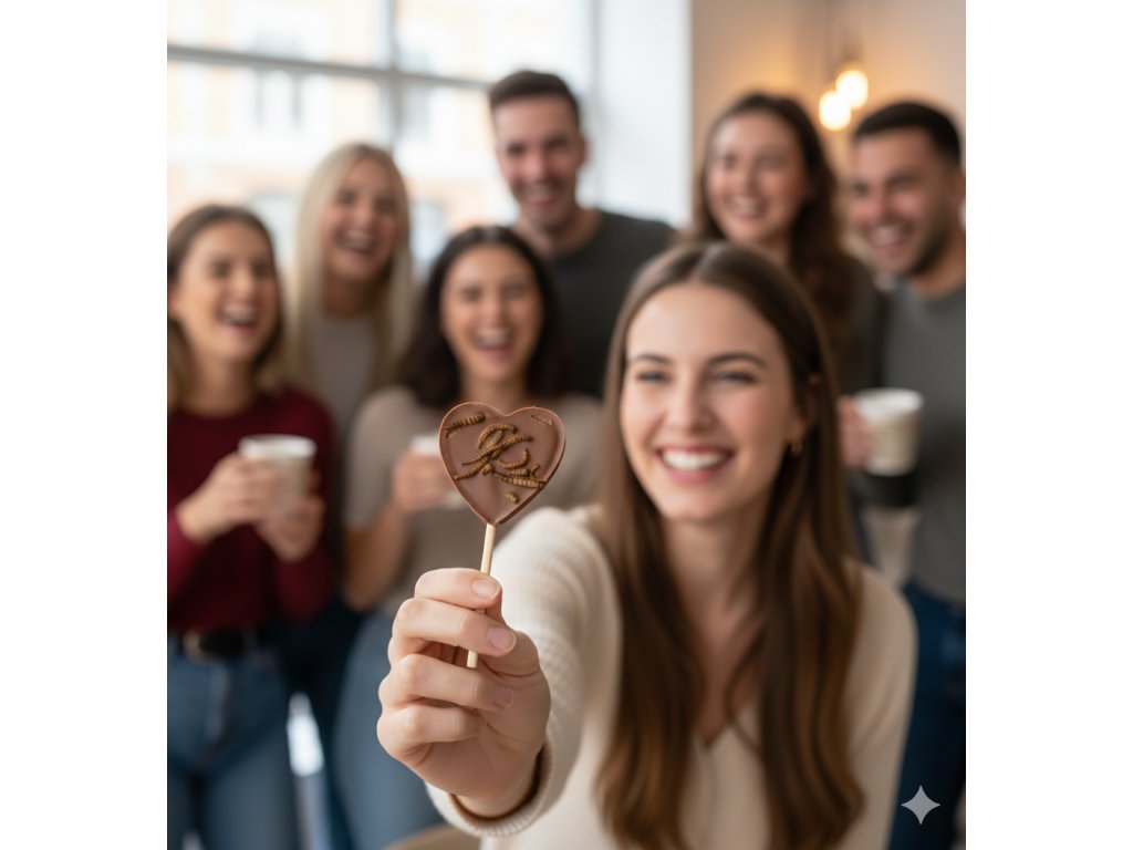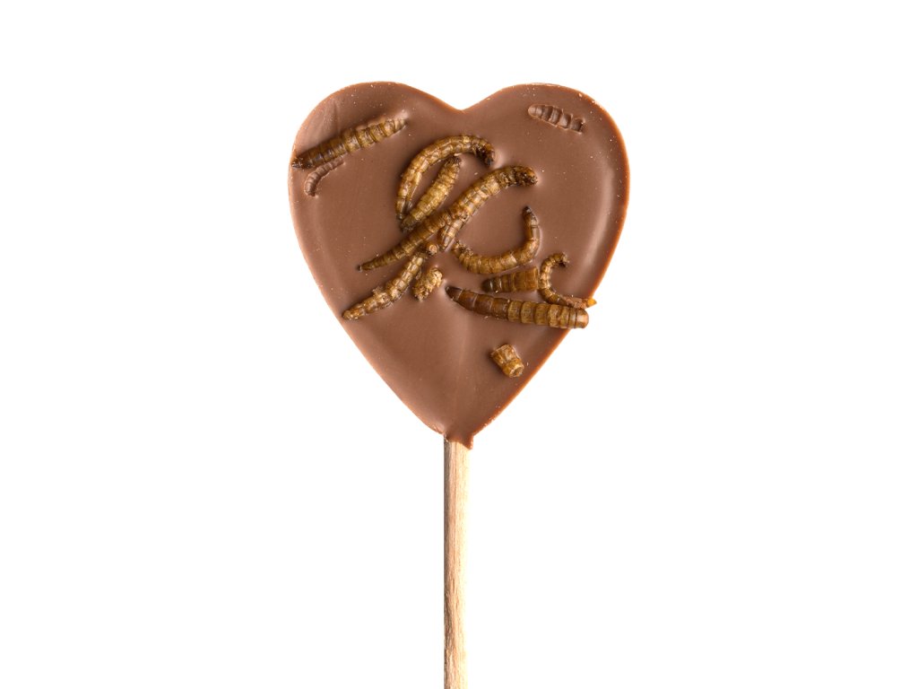 Ein Schokoladenlutscher in Herzform mit getrockneten Würmern ist ein perfekter Ausdruck von Liebe. Oder auch nicht. Wer kein Angsthase ist und hineinbeißt, wird sich sofort in den zarten Schokoladengeschmack verlieben. Und vielleicht auch in dich. Oder auch nicht – vielleicht schreit und quietscht sie/er und wirft dir das Lutscher an den Kopf – Spaß ist aber garantiert.